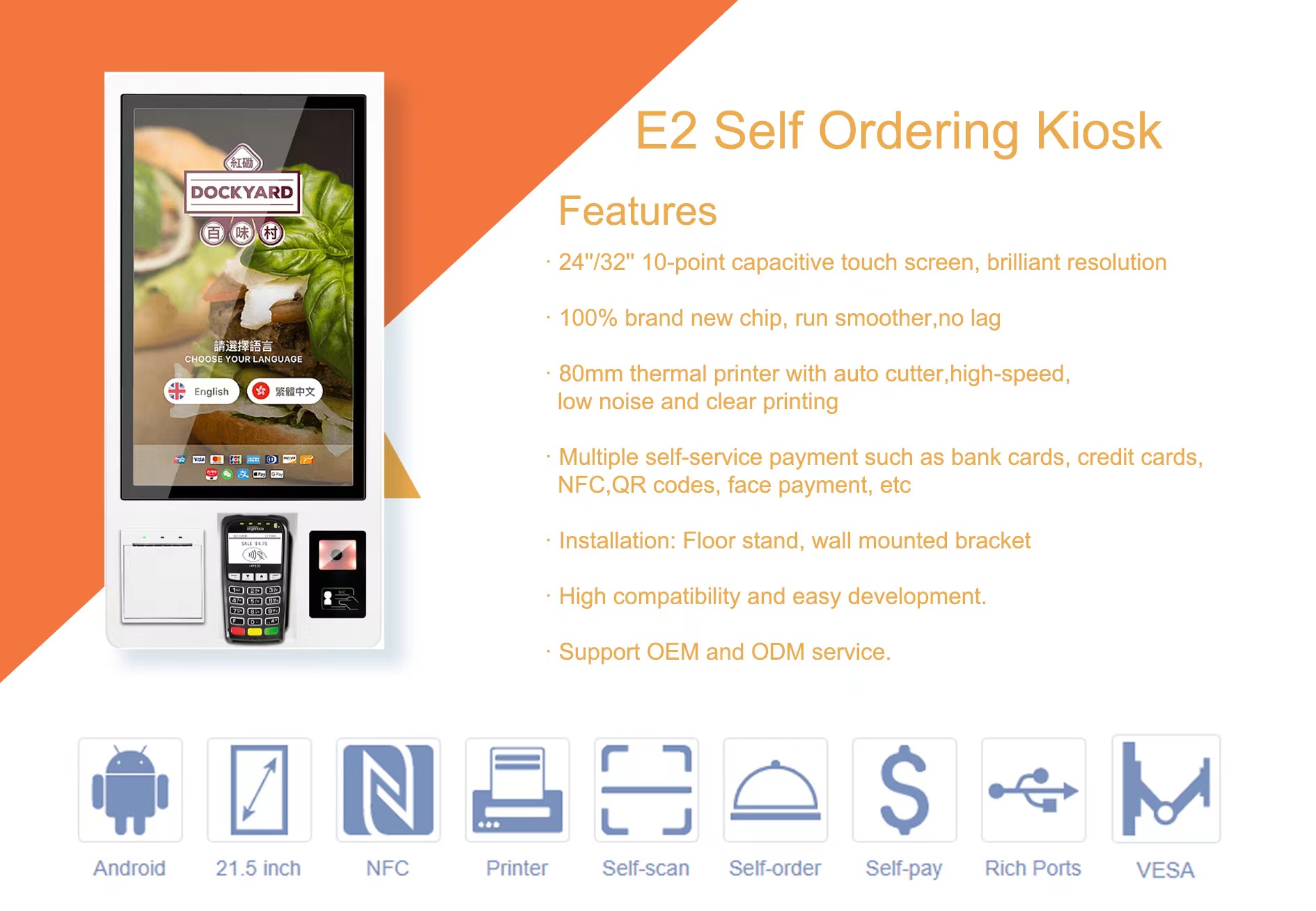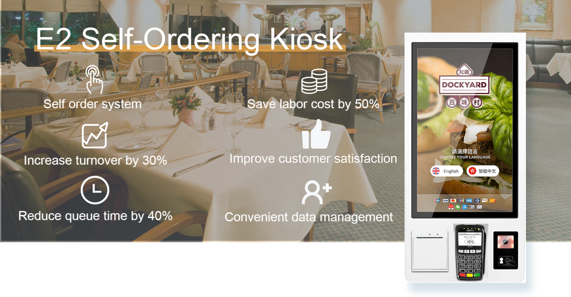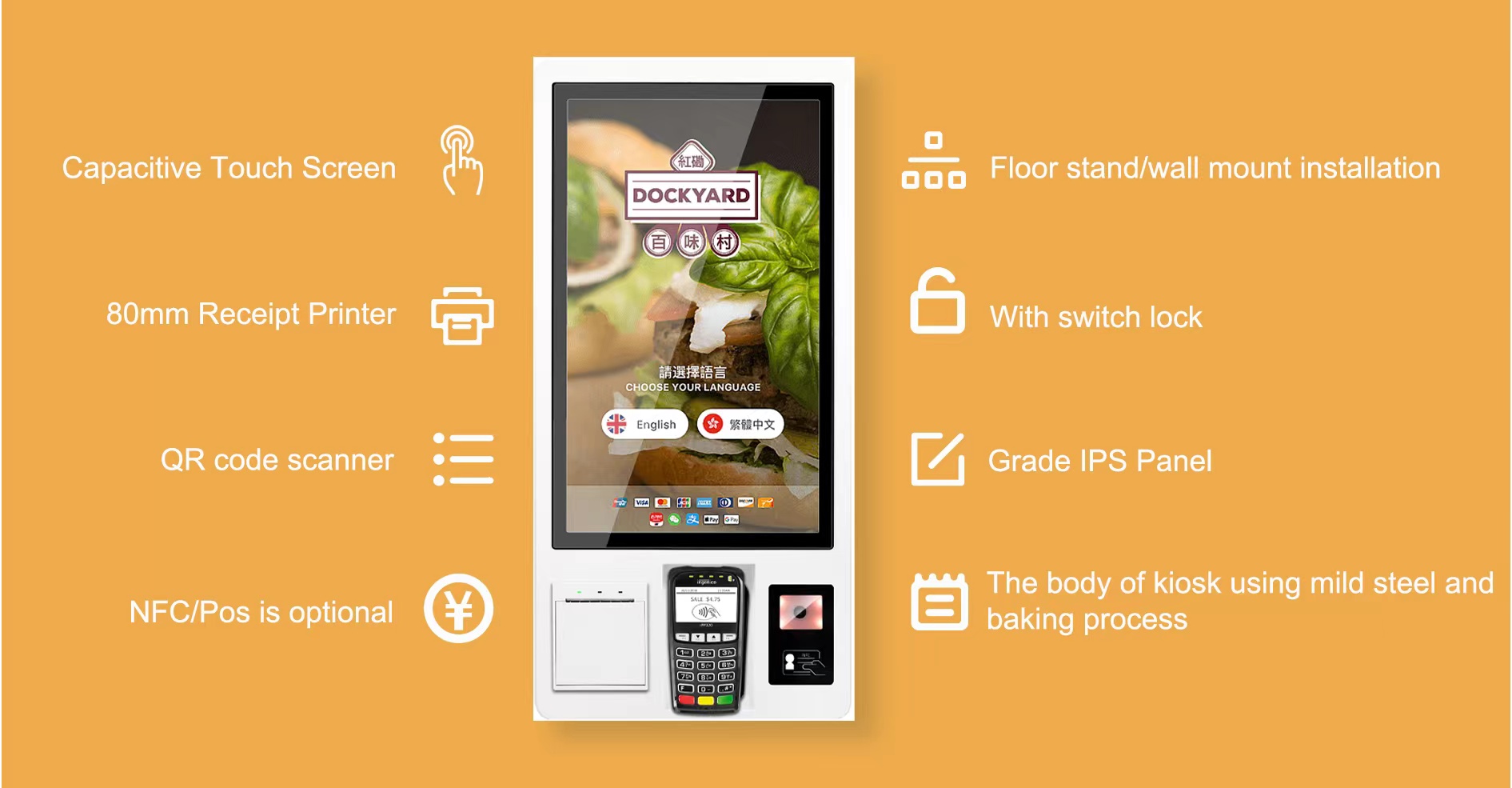 A self ordering kiosk can be employed as a self-service food ordering system wherein the customers can place an order directly at the kiosk. The kiosk is designed to provide a convenient, easy-to-use option for customers who wish to order food without employee assistance.